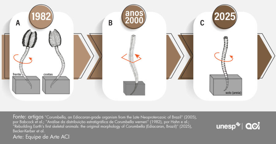 A equipe apresenta evidências de que a Corumbella, na verdade, era bem mais simples do que se especula — e vinha enganando os especialistas. “O tubo dela cônico-cilíndrico e feito de anéis justapostos, e muitos dos detalhes que intrigaram os cientistas por décadas na verdade eram marcas de deformação durante a fossilização”, explica Simões (reconstituição 3, de 2025).