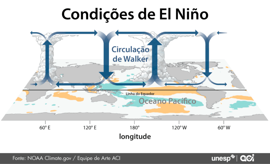 “O El Niño está associado a um aquecimento anômalo das águas do Oceano Pacífico. Se a água está mais quente, por condução ela esquenta a atmosfera adjacente. Esse ar quente sobe, ocupa o lugar do ar mais frio e perturba a troposfera [a camada da atmosfera mais próxima à superfície terrestre, que chega até 12 km de altura]”, explica Camila Carpenedo. “Essa perturbação gera ondas na atmosfera, ondas muito grandes, com um comprimento da ordem de 10.000 km. As cristas produzem áreas com alta pressão, ou vales, áreas de baixa pressão”, diz.
