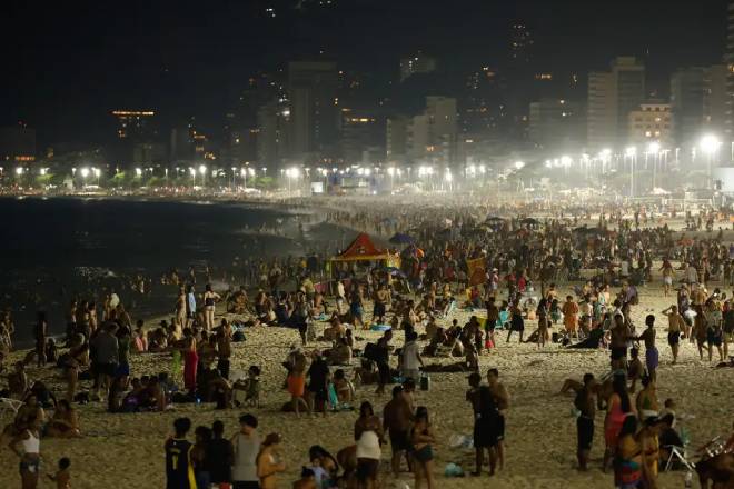 Imagem acima: Onda de calor no verão atrai frequentadores para a praia de Ipanema durante a noite, em janeiro de 2025. Crédito: Fernando Frazão/Agência Brasil