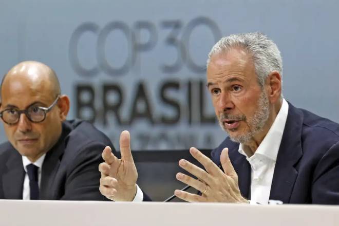 Imagem acima: O Secretário Executivo da Convenção-Quadro das Nações Unidas sobre Mudança do Clima (UNFCCC), Simon Stiell (esquerda), e o presidente da COP30, embaixador André Corrêa do Lago, durante coletiva de imprensa após a abertura da 30a. Conferência das Partes da Convenção-Quadro das Nações Unidas sobre a Mudança do Clima, na COP30. Crédito: Bruno Peres/Agência Brasil