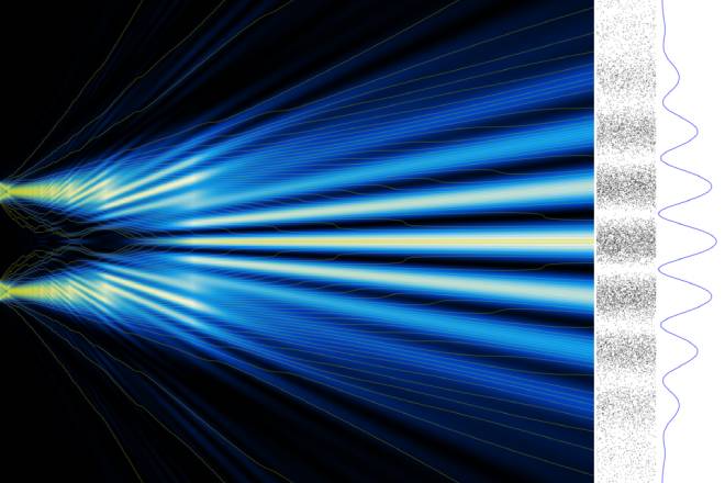 Imagem acima: Trajetória de elétrons no experimento da dupla-fenda, que demonstra a dualidade onda-partícula. Nela, as partículas quânticas podem se comportar tanto como ondas quanto como partículas. Crédito:  Alexandre Gondran